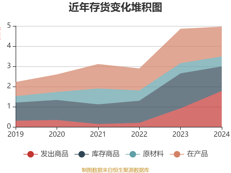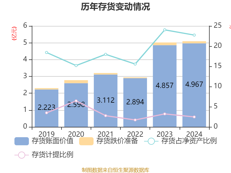 从存货变动来看,截至2024年末,公司存货账面价值为4.97亿元,占净资产的22.74%,较上年末增加1103万元。其中,存货跌价准备为1253.05万元,计提比例为2.46%。