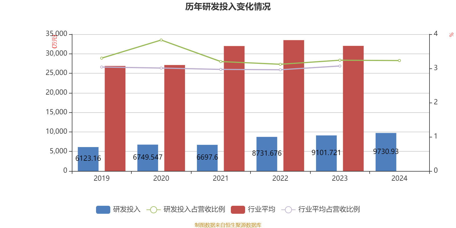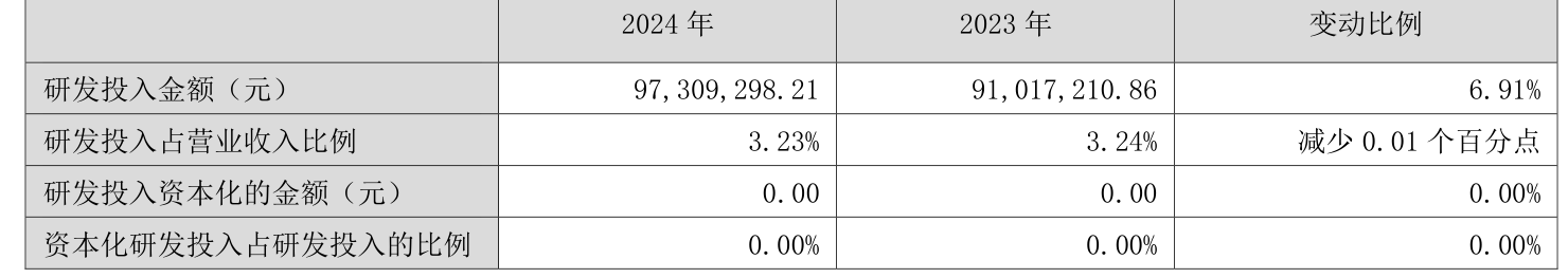 2024年全年,公司研发投入金额为9730.93万元,同比增长6.91%;研发投入占营业收入比例为3.23%,相比上年同期下降0.01个百分点。此外,公司全年研发投入资本化率为0%。
