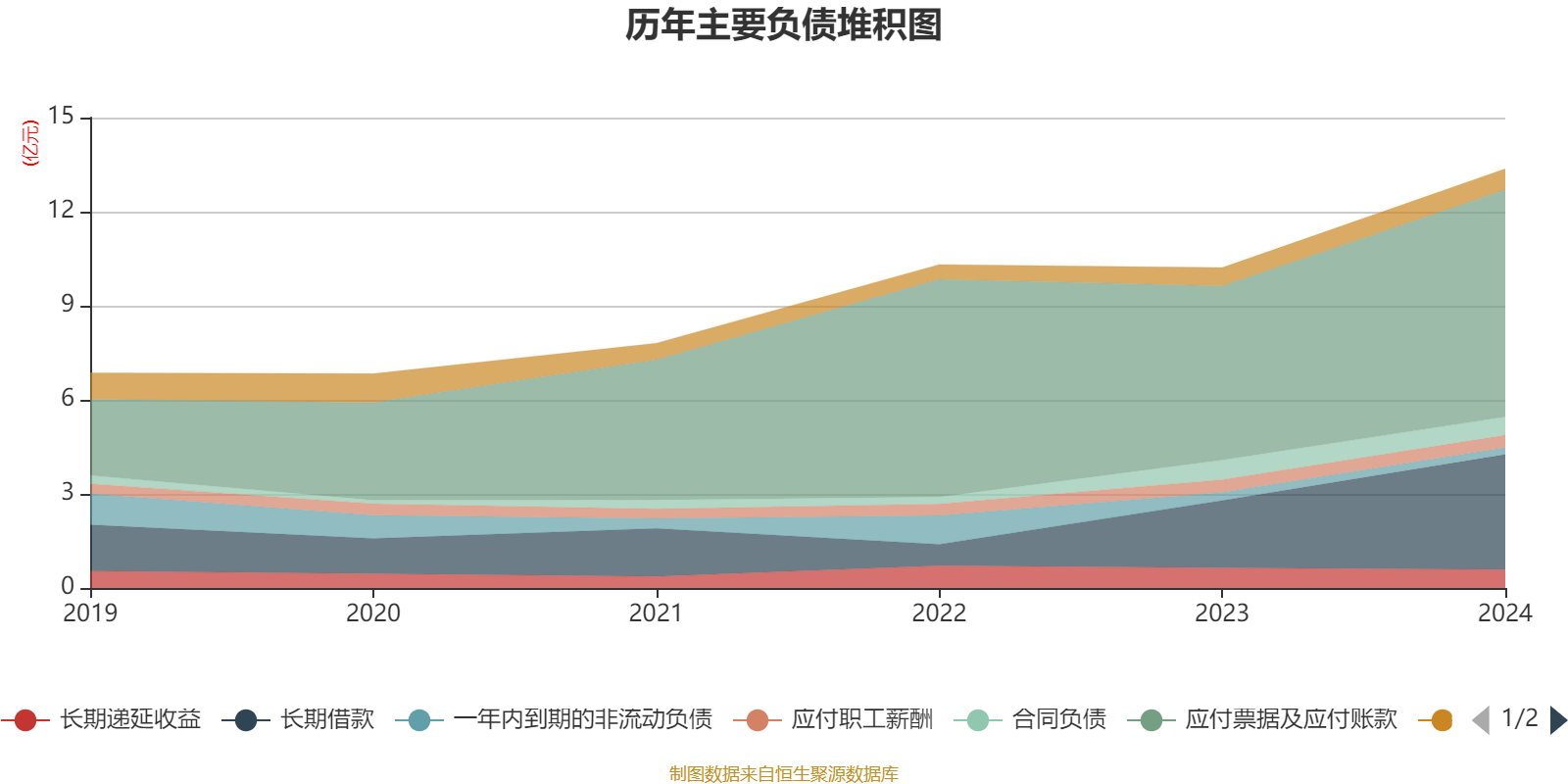 负债重大变化方面,截至2024年末,公司长期借款较上年末增加70.83%,占公司总资产比重上升3.34个百分点;应付票据及应付账款较上年末增加30.48%,占公司总资产比重上升2.48个百分点;长期递延收益较上年末减少8.58%,占公司总资产比重下降0.4个百分点;合同负债较上年末减少7.65%,占公司总资产比重下降0.37个百分点。